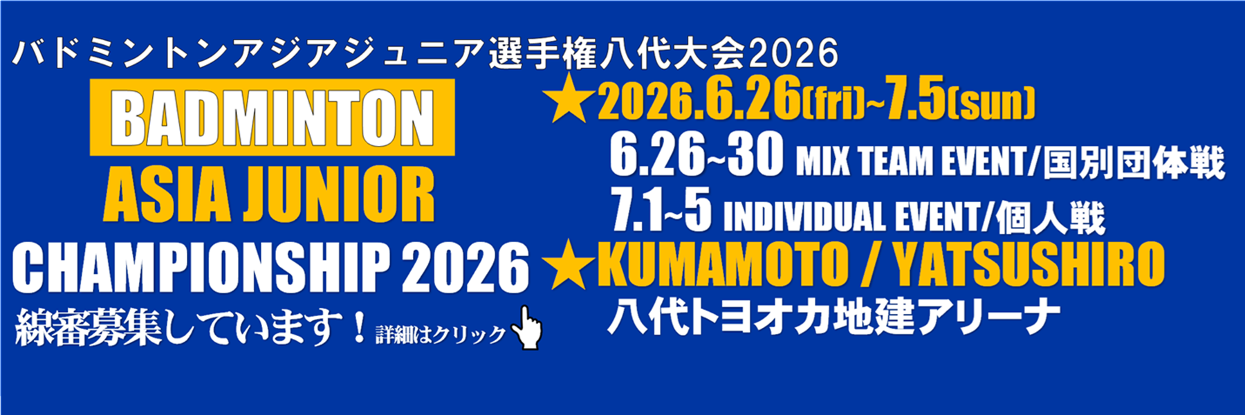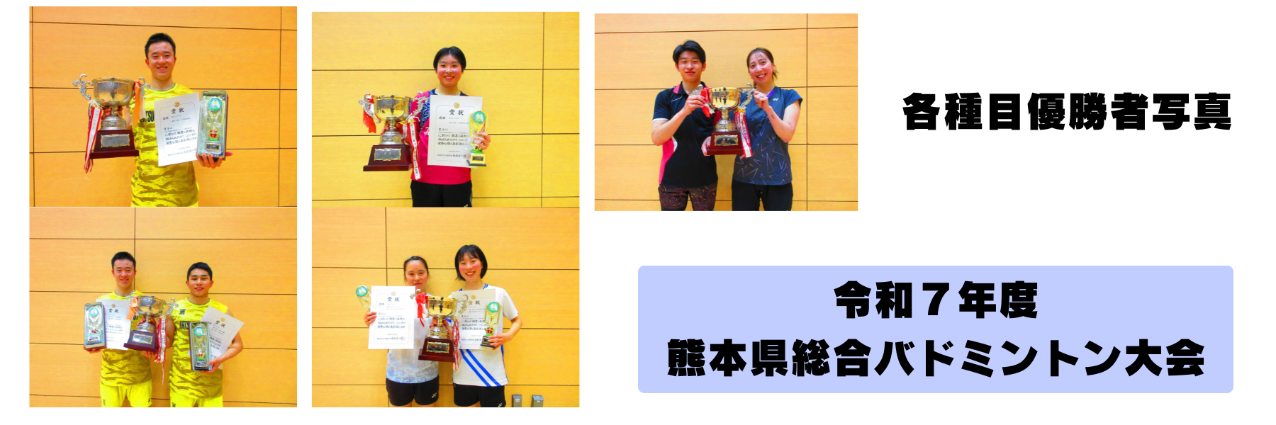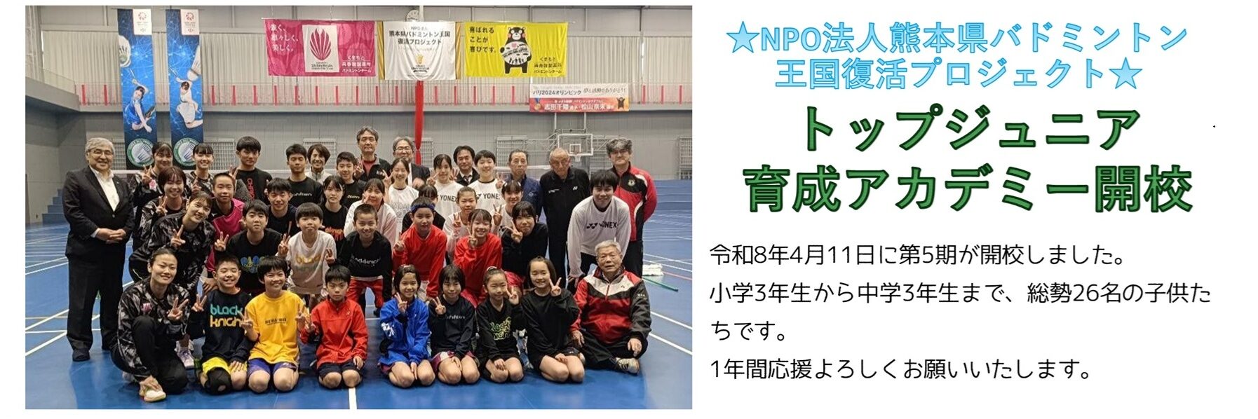 2023.12.10 お知らせ NPO法人熊本県バドミントン王国復活Pトップジュニア育成アカデミーの開催日程について 2026.04.11お知らせ中学校部会小学校部会 第43回全日本シニアバドミントン選手権大会県選考会 申込書・要項掲載 2026.04.11お知らせ社会人部会 令和8年度熊本県バドミントン協会登録・加盟のご案内 2026.04.08お知らせ 熊日ネクスポ2026熊本城オープンバドミントン大会 組合せ掲載 2026.04.07お知らせレディース部会 令和8年度強化指定選考結果掲載 2026.03.23お知らせ小学校部会 NPO法人バドミントン王国復活P育成アカデミーR8年度選考結果について 2026.03.20お知らせ中学校部会小学校部会 令和8年度第1回3級審判資格検定会について 2026.03.20お知らせ審判委員会 城南地区小学生バドミントン大会 冬季大会 結果掲載 2026.03.04お知らせ小学校部会 令和7年度熊本県総合バドミントン選手権大会 組合せWS・WDを一部修正しました。 2026.02.28お知らせ社会人部会 令和8年度強化指定選手 選考会要項 2026.02.27お知らせ小学校部会 大会情報 第43回全日本シニアバドミントン選手権大会県選考会 2026.04.11大会要項社会人部会 城南地区小学生バドミントン大会 冬季大会 2026.02.03大会要項小学校部会 熊日ネクスポ2026熊本城オープンバドミントン大会 2026.02.03レディース部会大会要項 県小学生総合バドミントン選手権大会 2026.01.06大会要項小学校部会 令和7年度熊本県総合バドミントン選手権大会 2026.01.05大会要項社会人部会 令和7年度 本郷杯クラブ対抗バドミントン大会 2025.10.18大会要項社会人部会 第71回全九州社会人バドミントン選手権大会 2025.10.02大会要項社会人部会 『新市誕生20周年記念事業』第4回九州小学生PGAバドミントン大会 2025.09.06お知らせ大会要項小学校部会 第20回全日本レディースバドミントン競技大会(個人戦) 2025.08.26レディース部会大会要項 令和7年度熊本県社会人バドミントン選手権大会 2025.08.06大会要項社会人部会